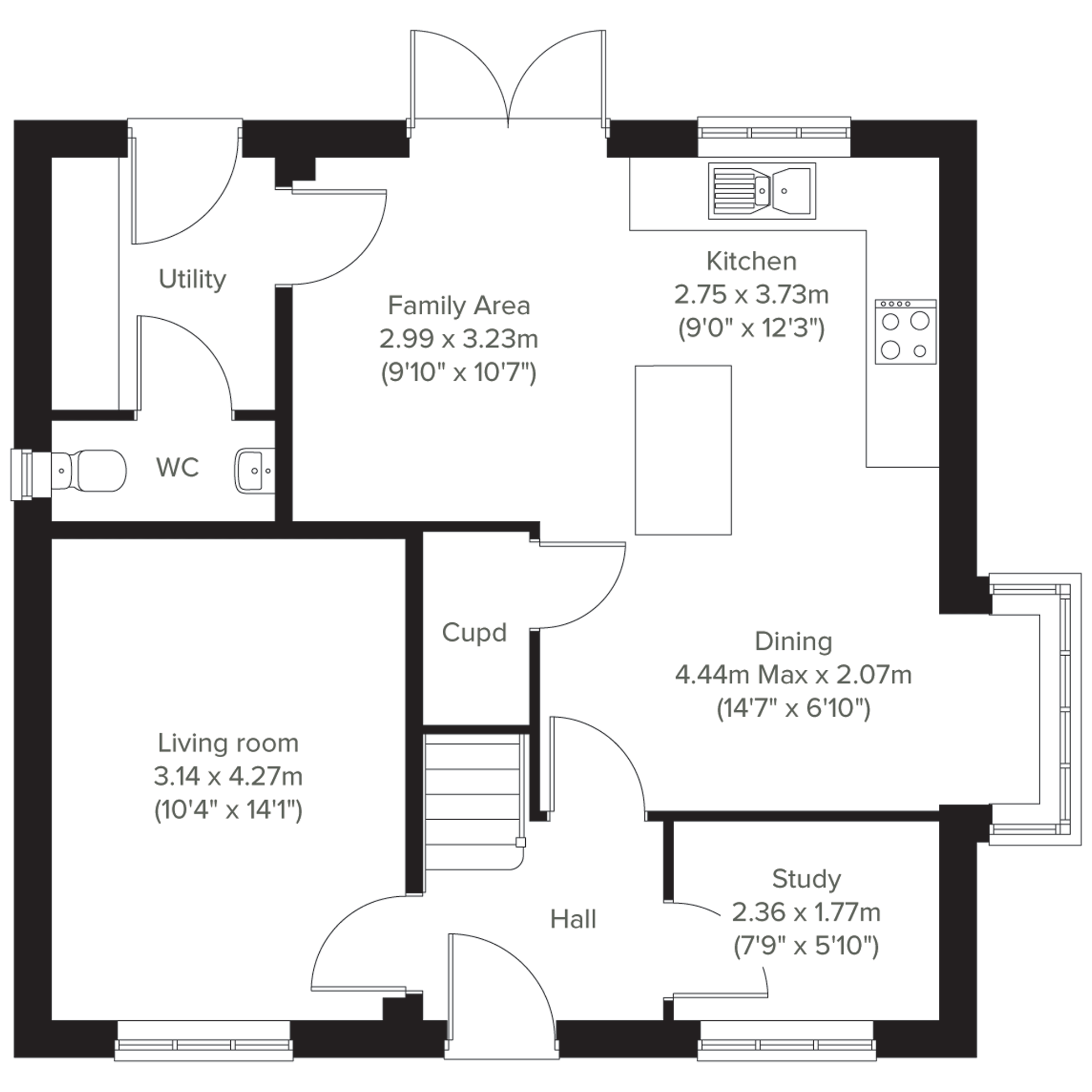 This fantastic house is designed with family life in mind. The four-bedroom Blackwater A V1 features an impressive open-plan kitchen/dining/family room with French doors to the garden and a bay window - perfect for entertaining and spending time together. Theres also a separate living room and study, downstairs utility and WC, en suite to bedroom one and several handy storage cupboards.
