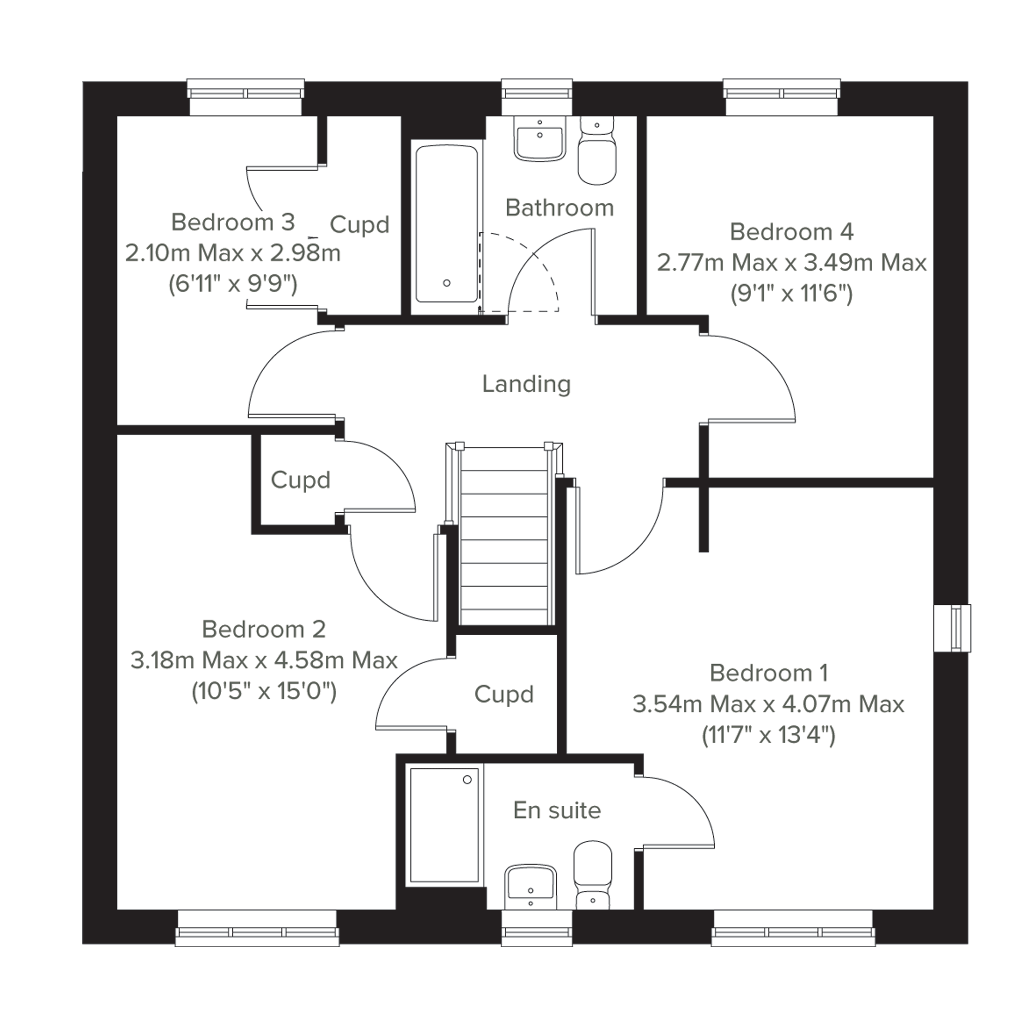 An attractive three-storey home, the Panfield has an open-plan kitchen/dining room, a living room and four bedrooms. The top floor bedroom has an en suite and storage cupboard.