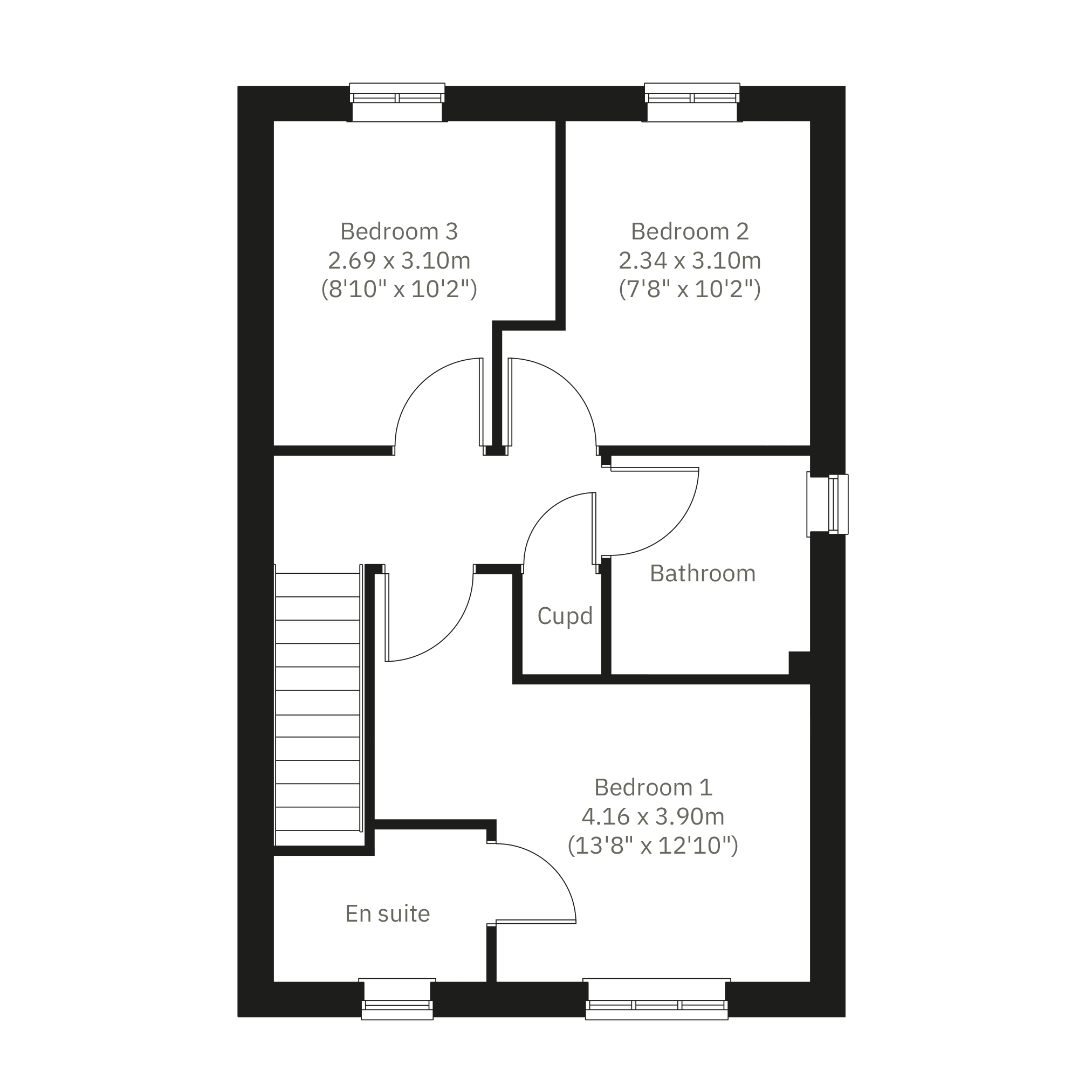 The popular Galvin is a three-bedroom family home with a bright and modern open plan kitchen/dining room with French doors leading into the garden. The downstairs WC, handy storage cupboard and en suite to bedroom one mean it ticks all the boxes for practical family living.
