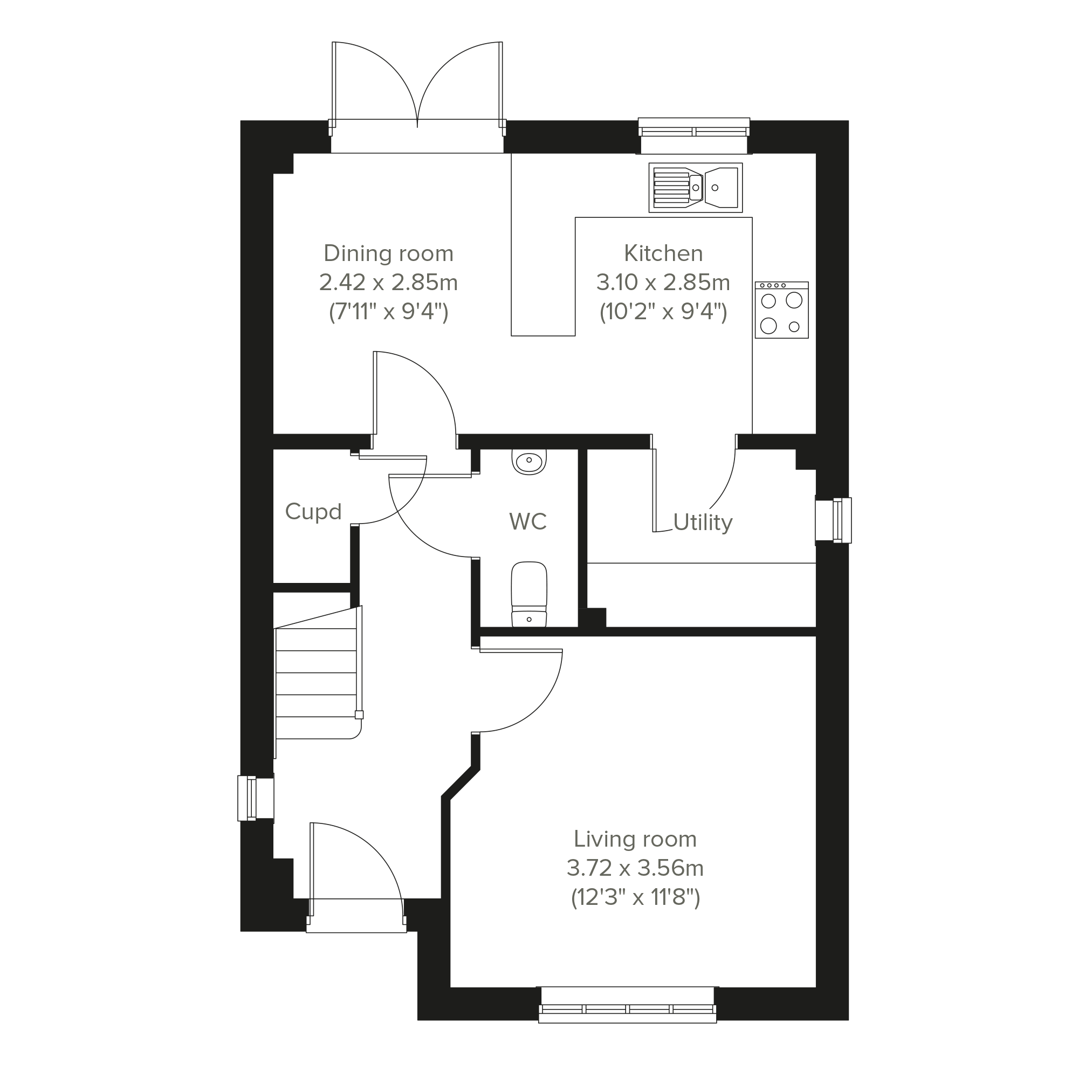 The Lambridge is a four-bedroom family home with a spacious kitchen/dining area with French doors to the rear garden, a bright living room with a bay window, utility room, and a downstairs WC.