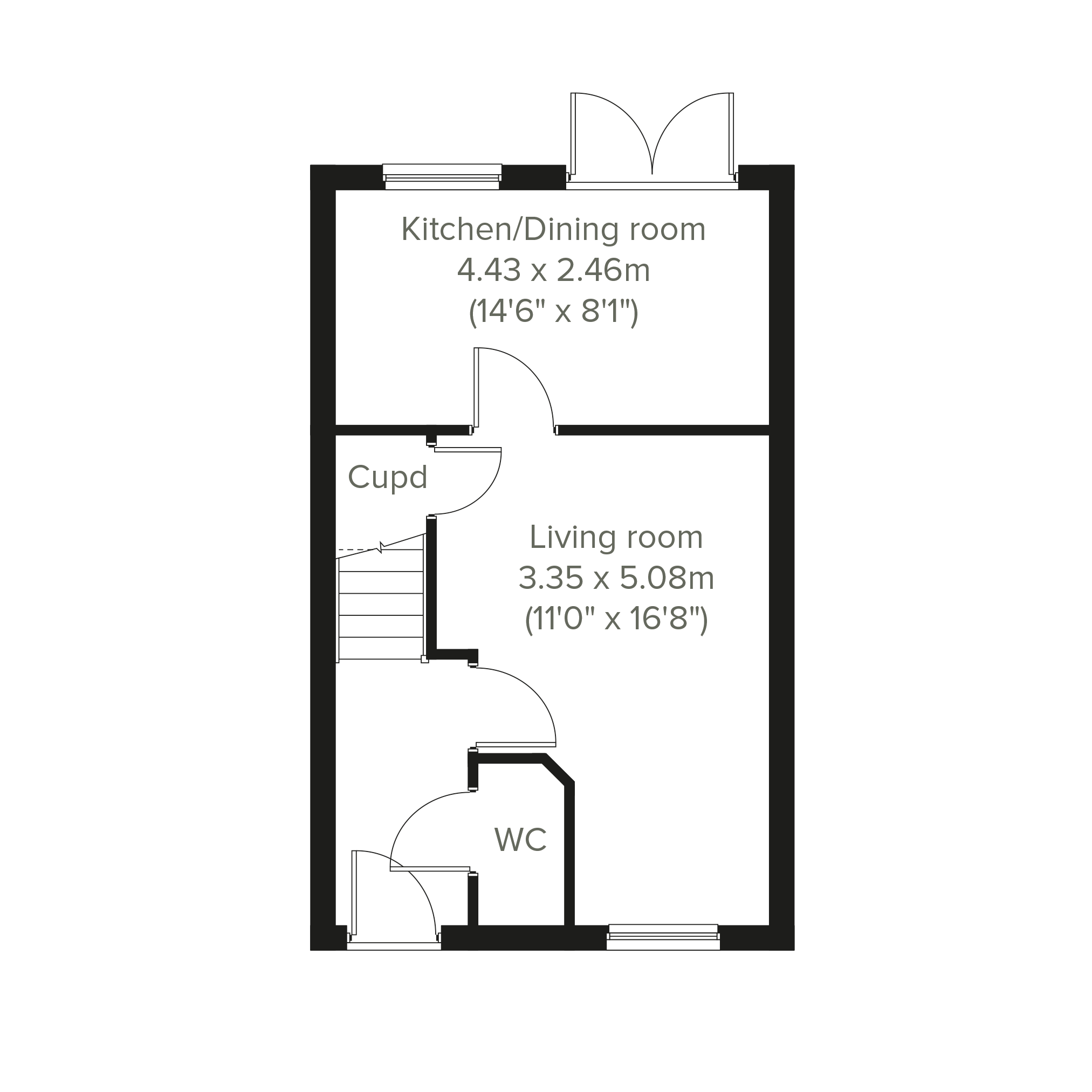 The Pannal is a two-bedroom home featuring a bright open-plan kitchen/dining room with French doors leading into the garden, a spacious living room and WC. Upstairs, front-facing bedroom one fills the whole width of the house, while bedroom two and the bathroom overlook the garden.