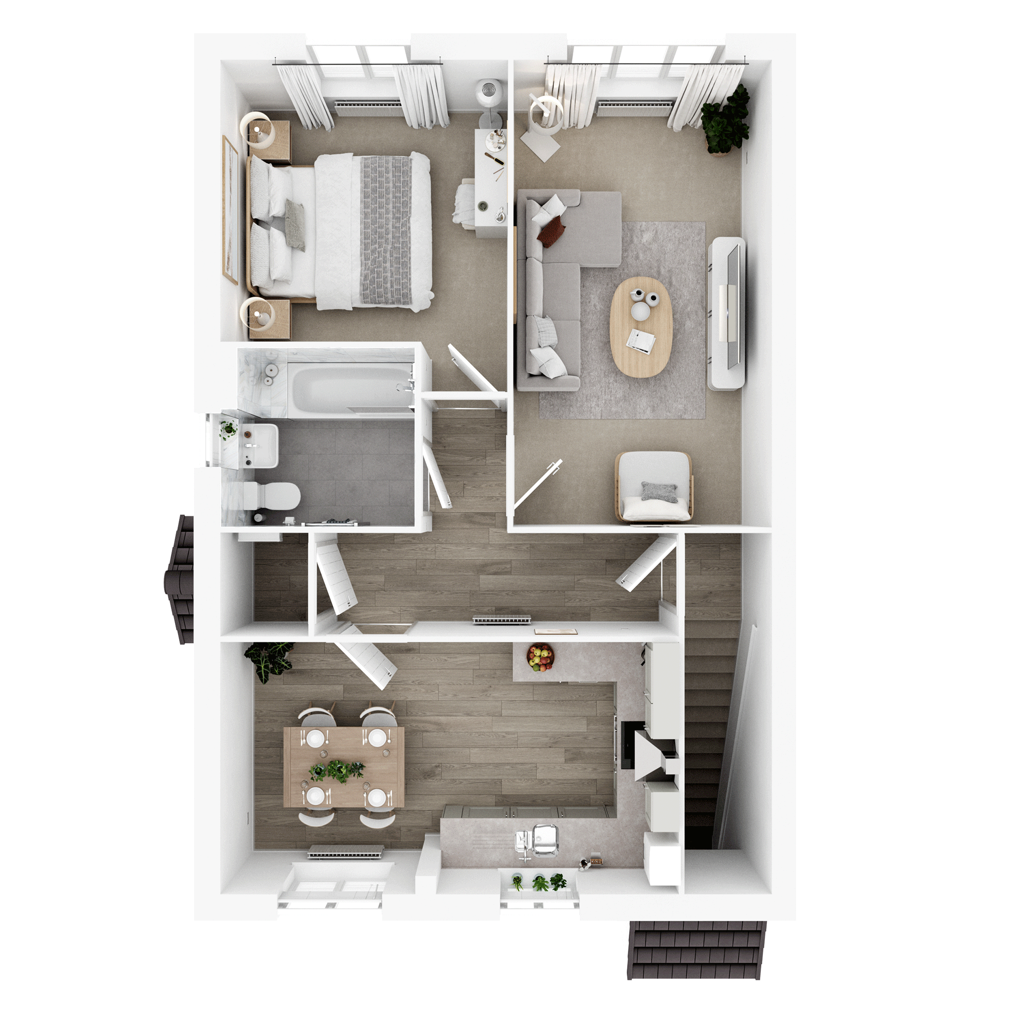 The Linton puts a fabulous kitchen/dining room. There`s a bright rear-aspect living room. Good sized bedroom. The bathroom and two more built-in storage cupboards complete the first floor.