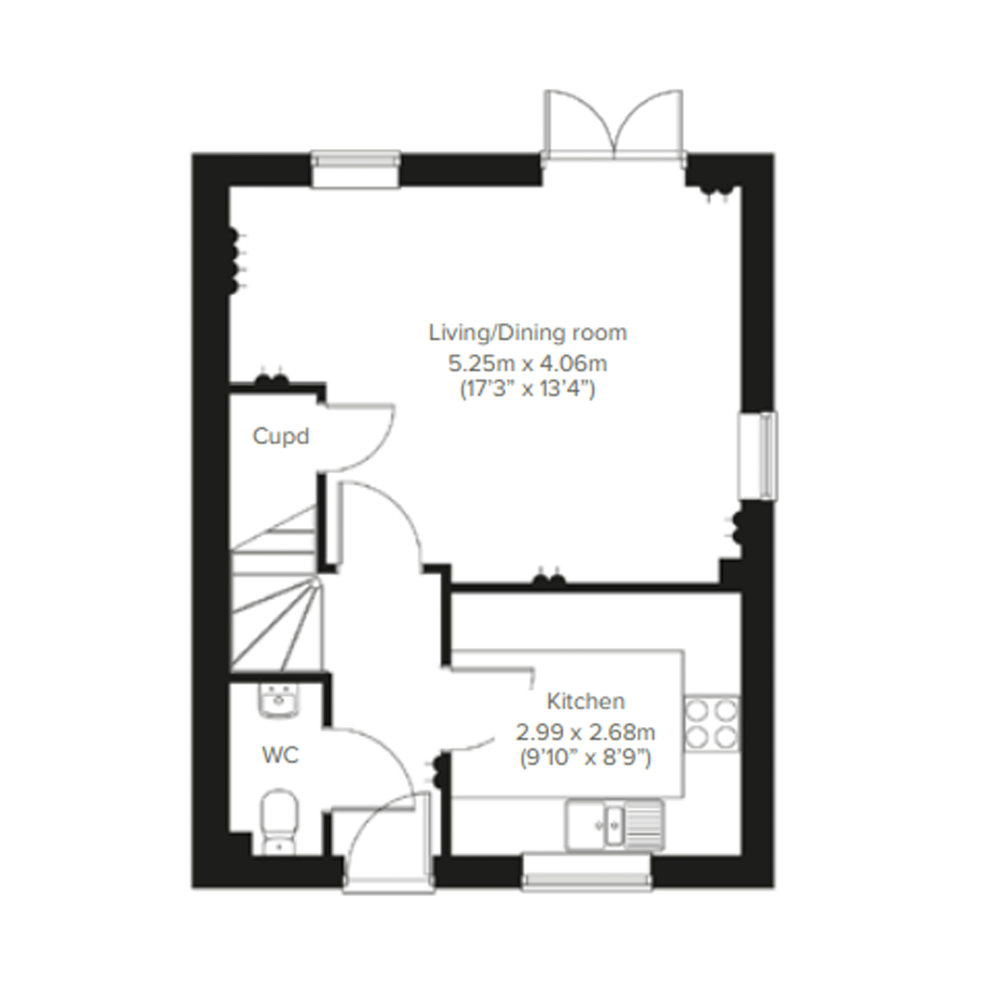 The Ithon is a two-bedroom home with an open-plan layout. French doors lead into the garden and make the ground floor lovely and light. A downstairs WC is a great practical feature.