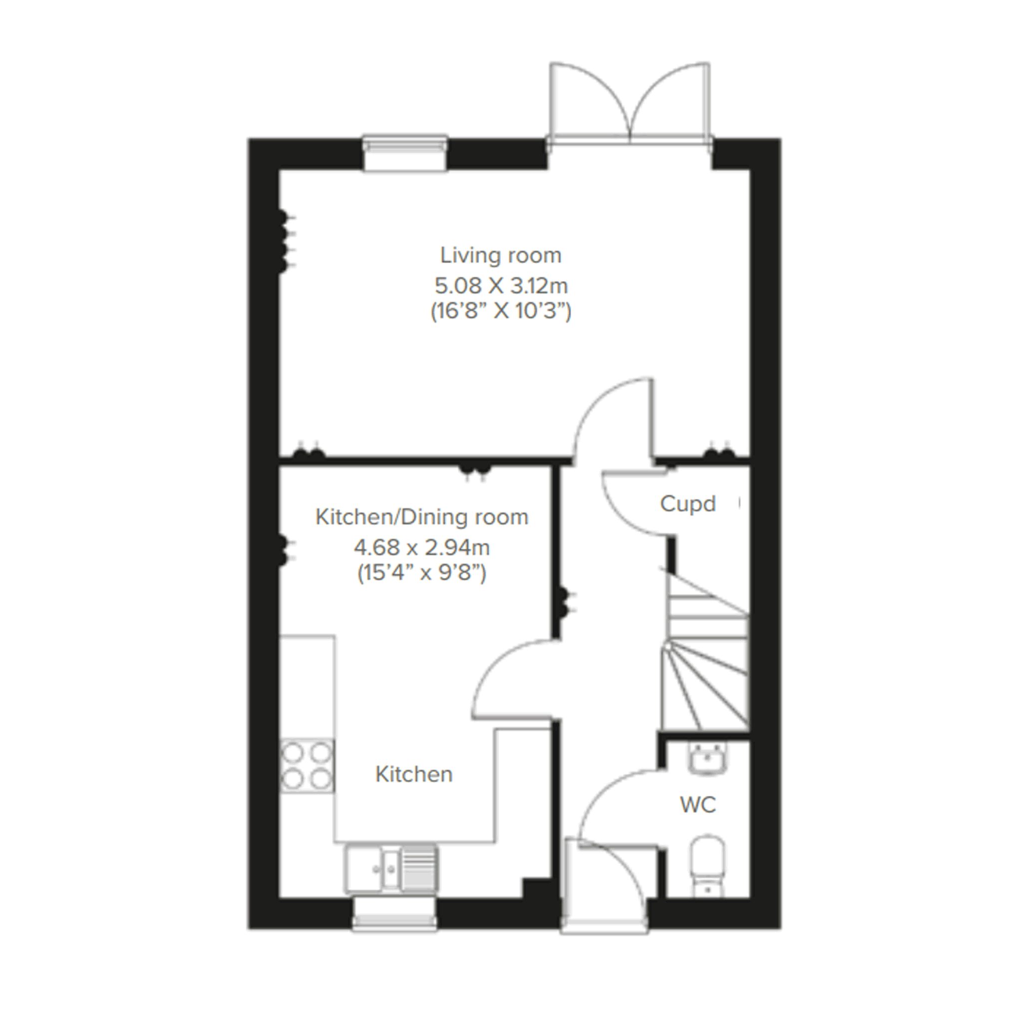 The Ithon is a two-bedroom home with an open-plan layout. French doors lead into the garden and make the ground floor lovely and light. A downstairs WC is a great practical feature.