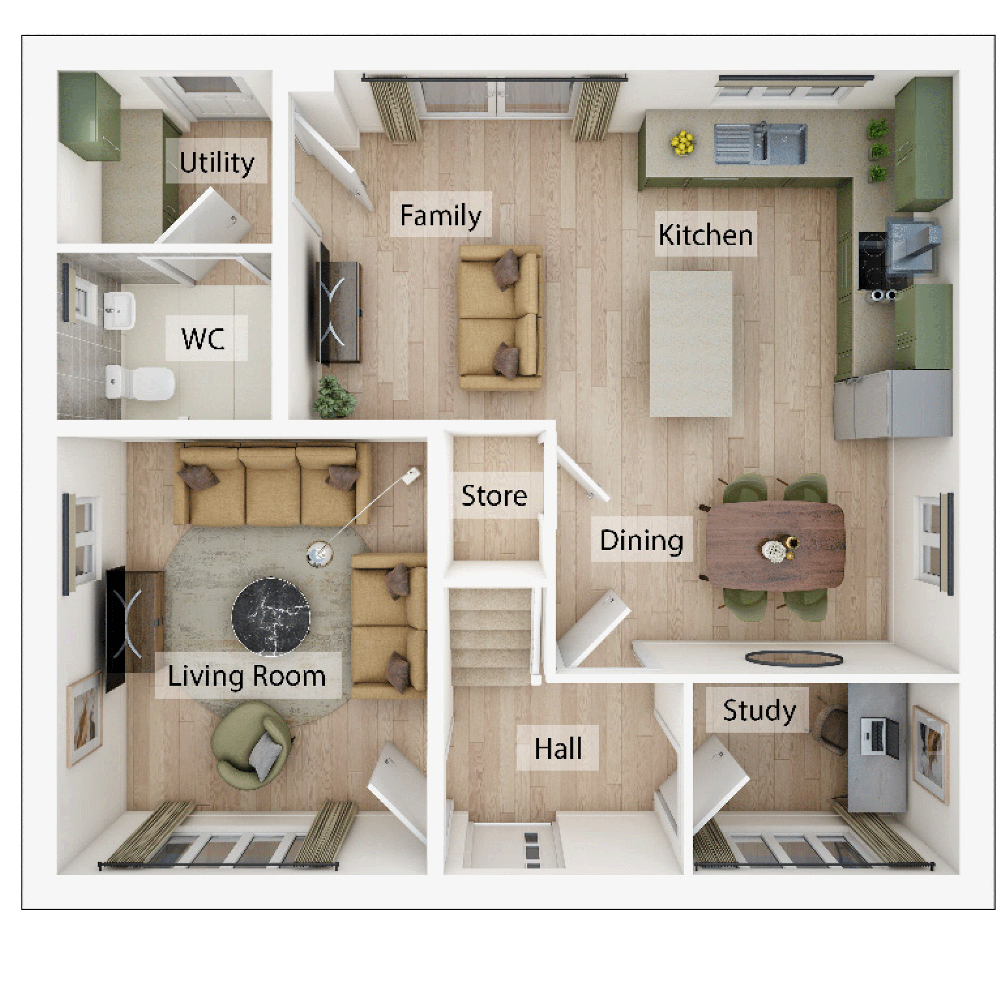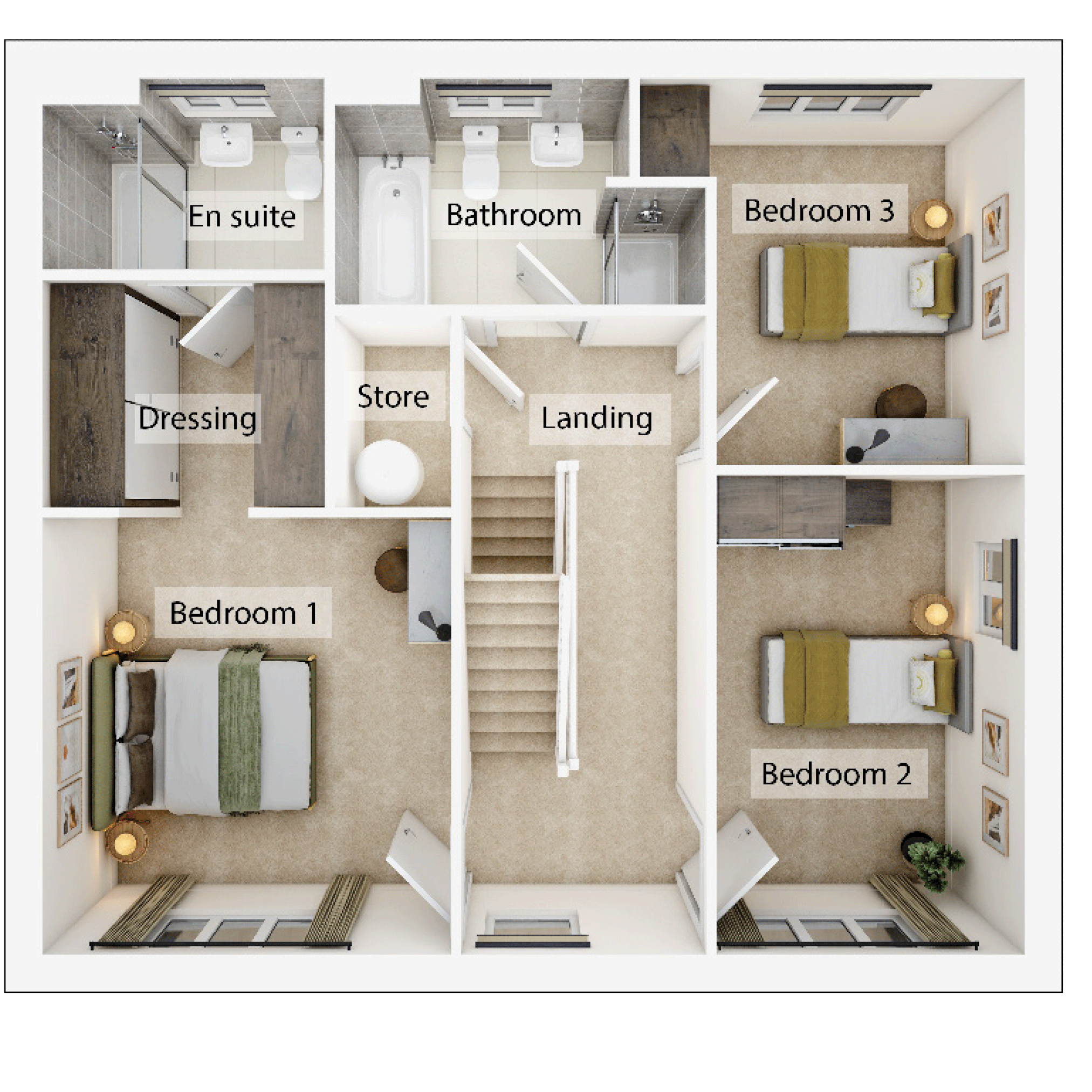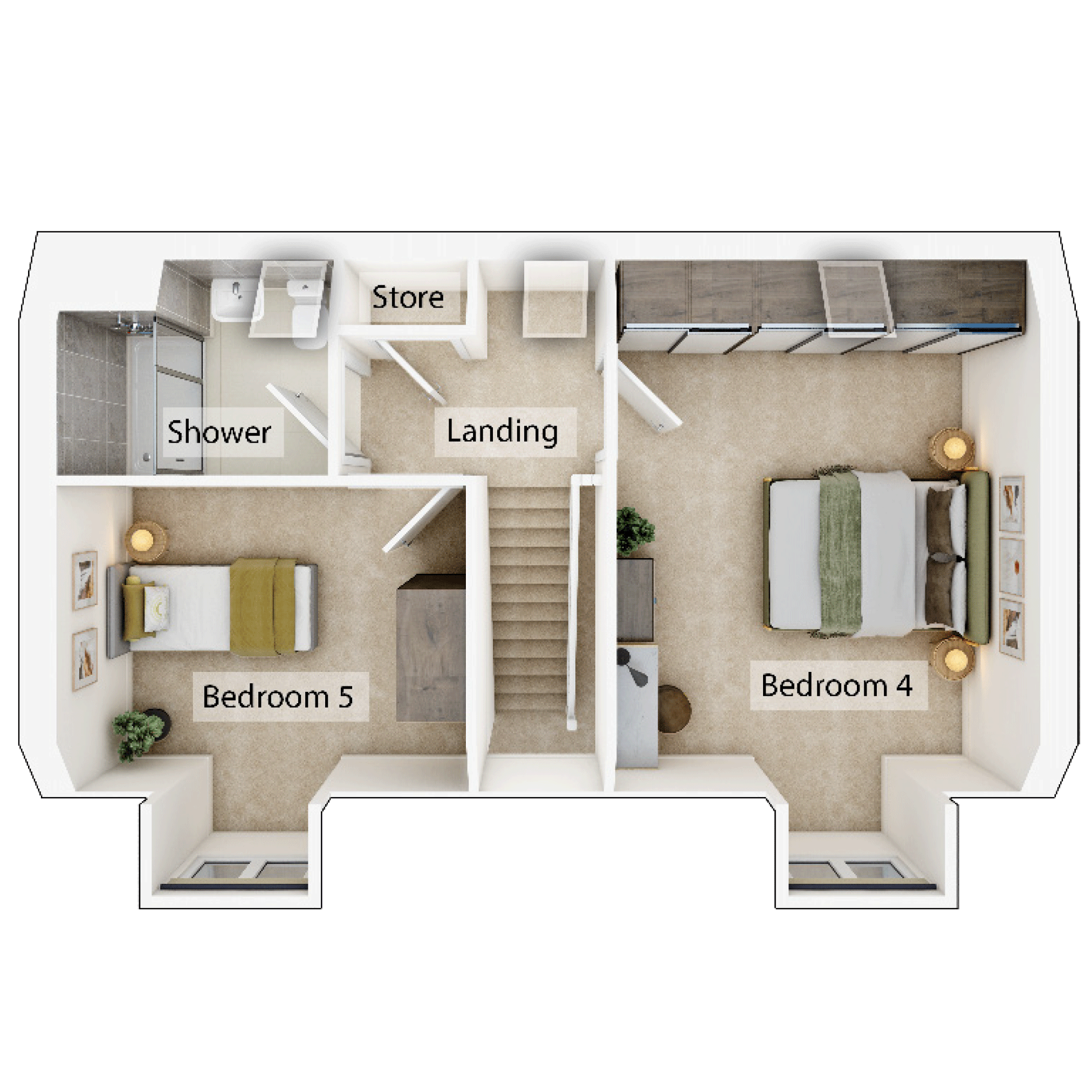 A stunning detached home with an impressive open plan kitchen/dining/family room, the Brightstone has five bedrooms and is perfectly designed for modern family living. Its other features include a bright family living room and separate study. The first floor bedroom one is spacious with a large en suite and dressing area. This floor is home to a further two bedrooms and a family bathroom. The second floor is home to two more bedrooms, a bathroom and a handy storage cupboards.