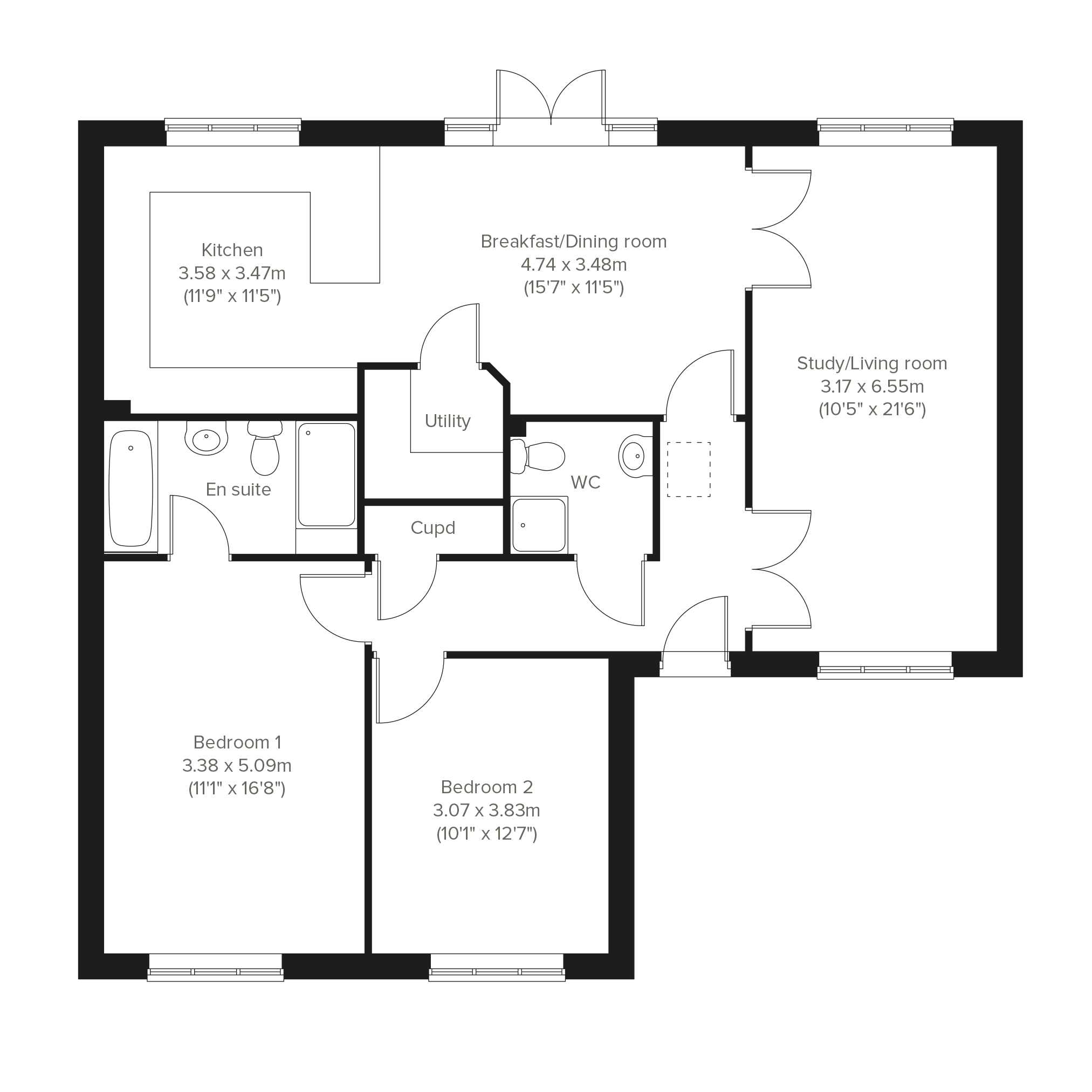 The Gloucester is a spacious and well-planned two-bedroom bungalow that combines comfort, practicality and style. The kitchen flows into a generous dining/breakfast area with access to the garden, creating a great space for everyday living. A separate room offers the option of a cosy living room or a bright home office. Bedroom one includes a private en suite and dressing area, while the second double bedroom is just across the hall. With a utility room, WC and built-in storage, this home is as organised as it is inviting.