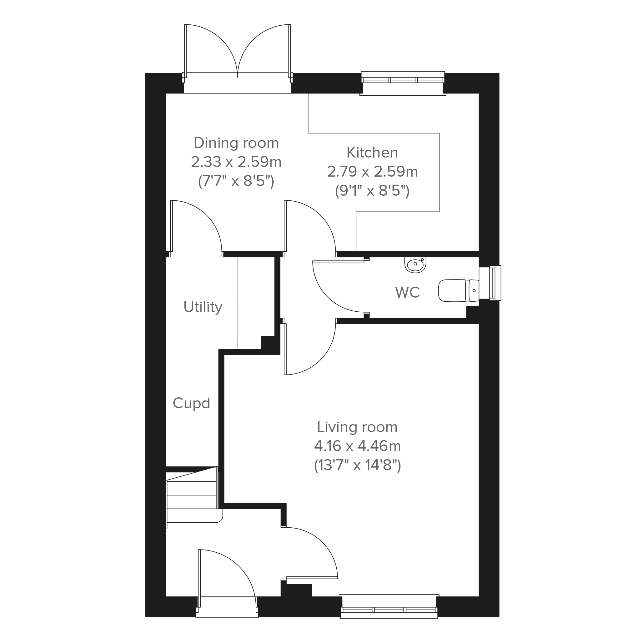 On the ground floor of the Darwin, there is a kitchen/dining room with French doors leading to the garden, a living room, utility, internal garage, storage cupboard under the stairs and a WC.