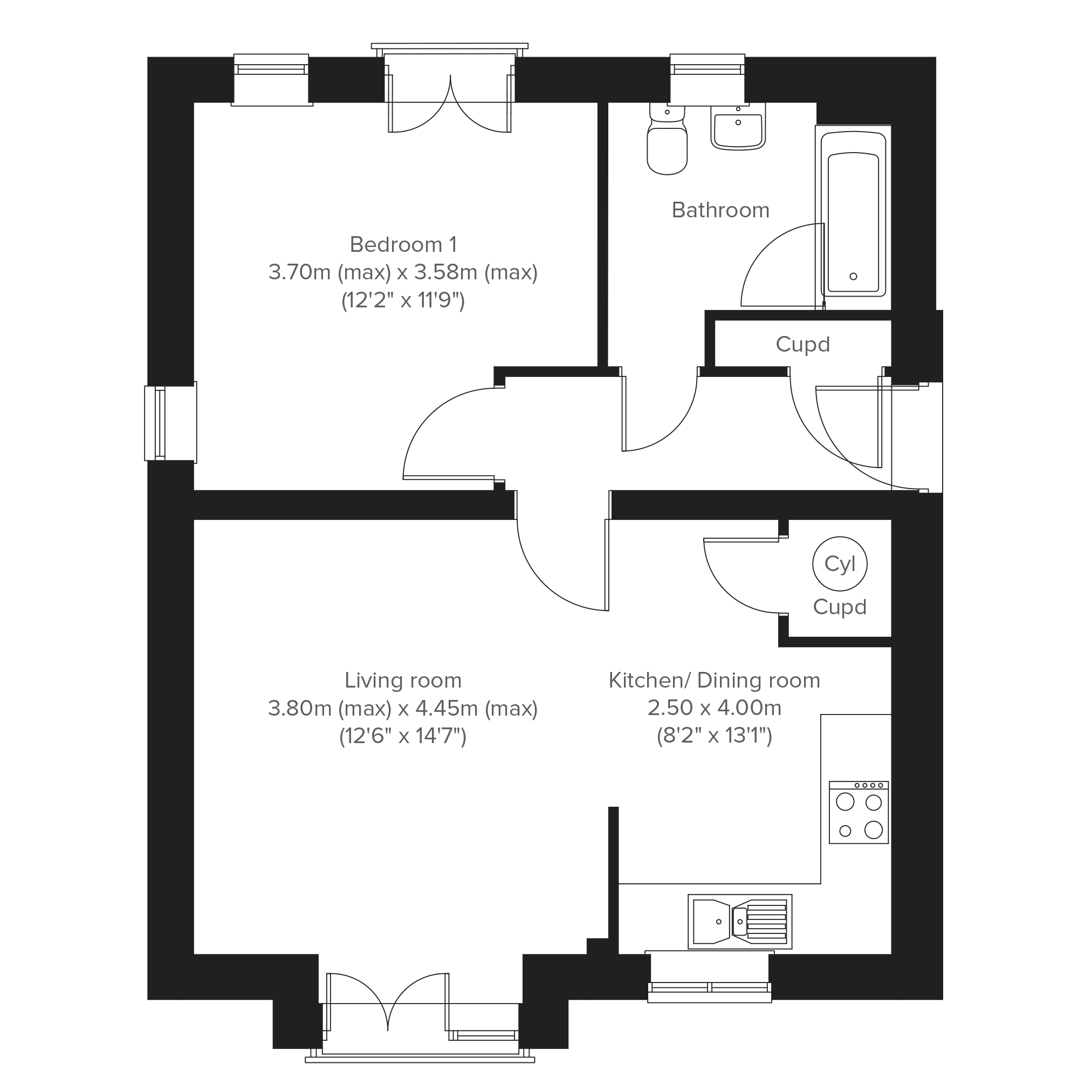 The Cranbourne apartment has a modern open plan kitchen/dining/living room with French doors/Juliet balcony (plot specific), a spacious bedroom, a good-sized bathroom and two handy storage cupboards.