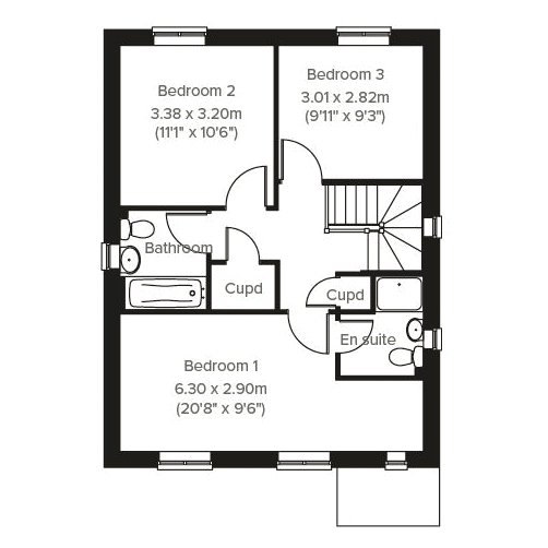 An attractive three-storey home, the Saunton has an open-plan kitchen/dining room, a living room and three bedrooms. The top floor bedroom has an en suite.