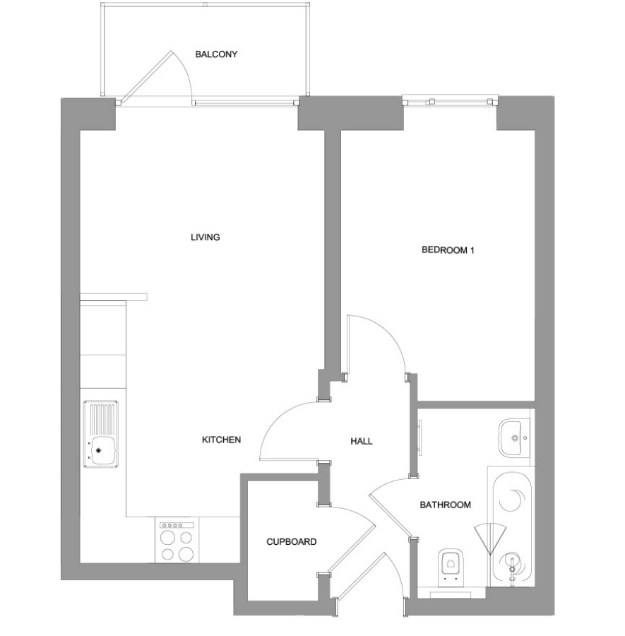 From the entrance hallway, you have a spacious open-plan kitchen/living/dining room to the left of the apartment, including balcony access from the living area. To the right, you have a master bedroom plus a family bathroom.
