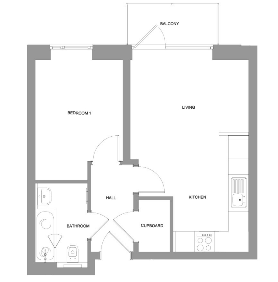 From the entrance hallway, you have a spacious open-plan kitchen/living/dining room to the right of the apartment, including balcony access from the living area. To the left, you have a master bedroom plus a family bathroom.