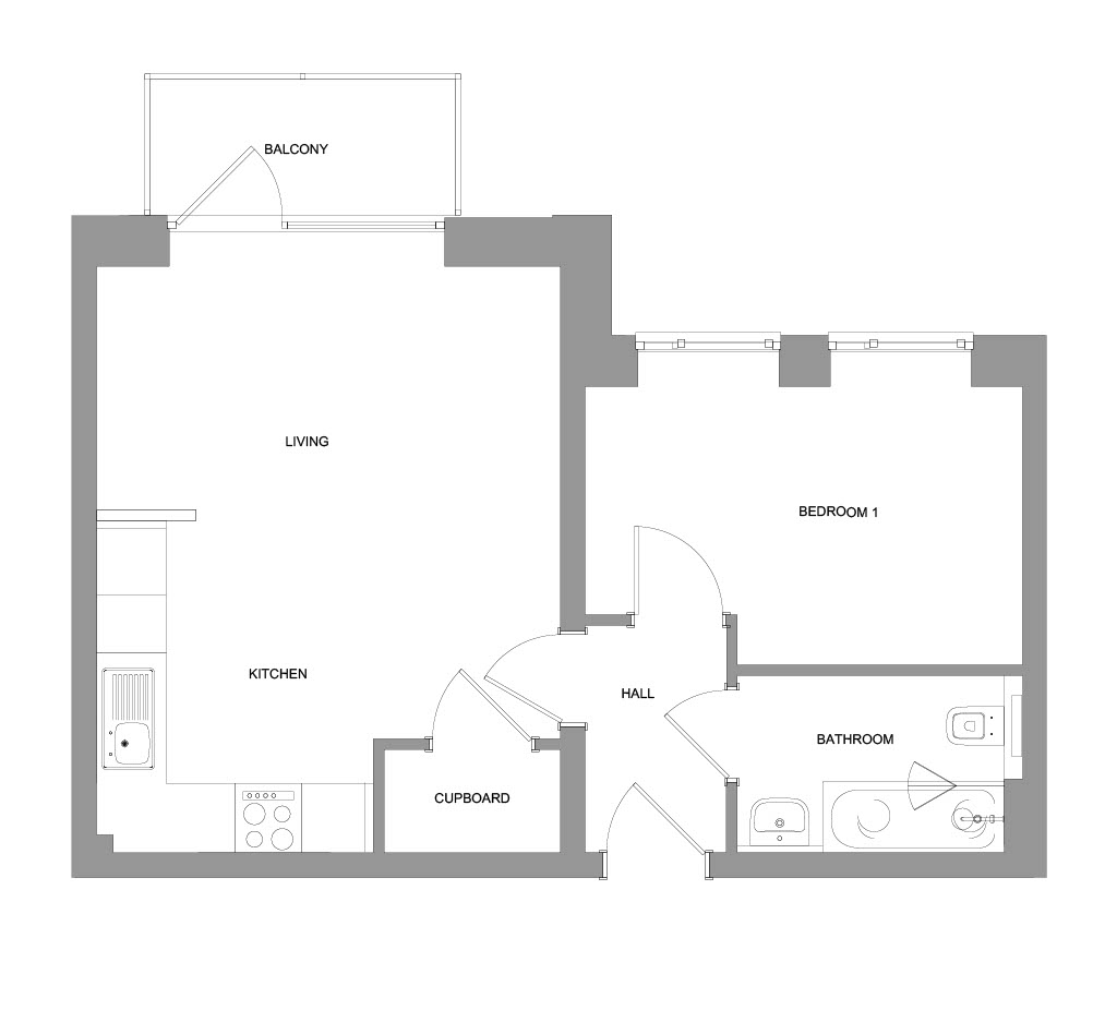 From the entrance hallway, you have a spacious open-plan kitchen/living/dining room to the left of the apartment, including balcony access from the living area. To the right, you have a master bedroom plus a family bathroom.