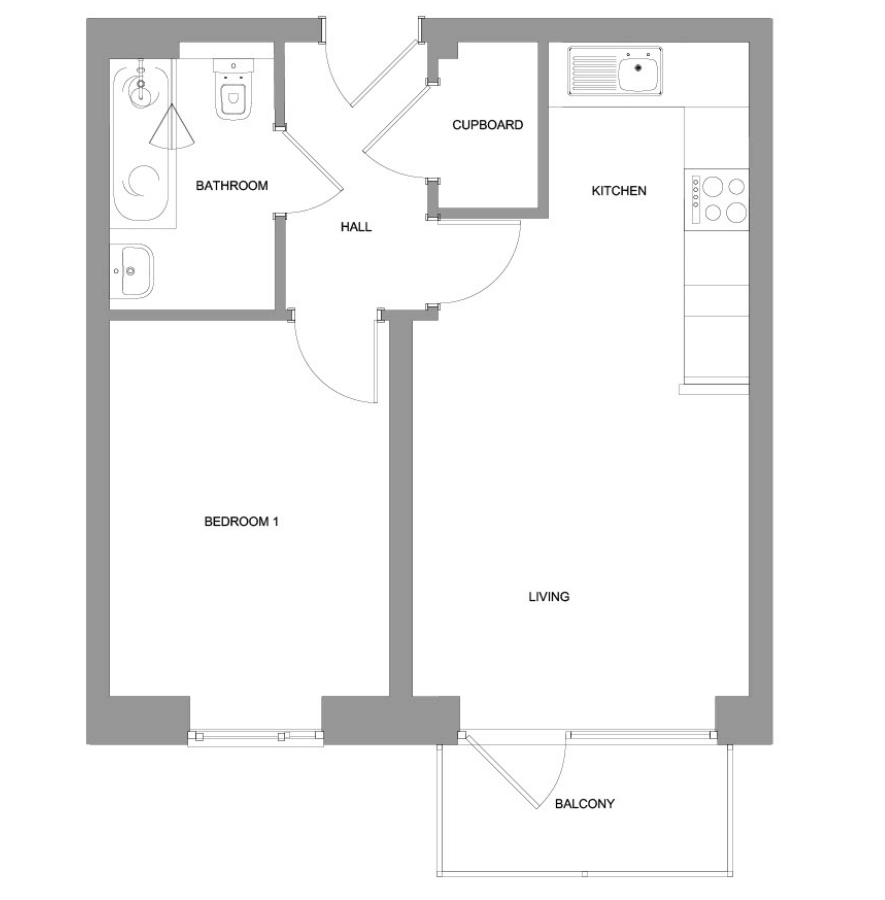 From entering the apartment, you have a spacious open-plan kitchen/living/dining room to the left, including balcony access from the living area. To the right, you have a master bedroom plus a family bathroom.