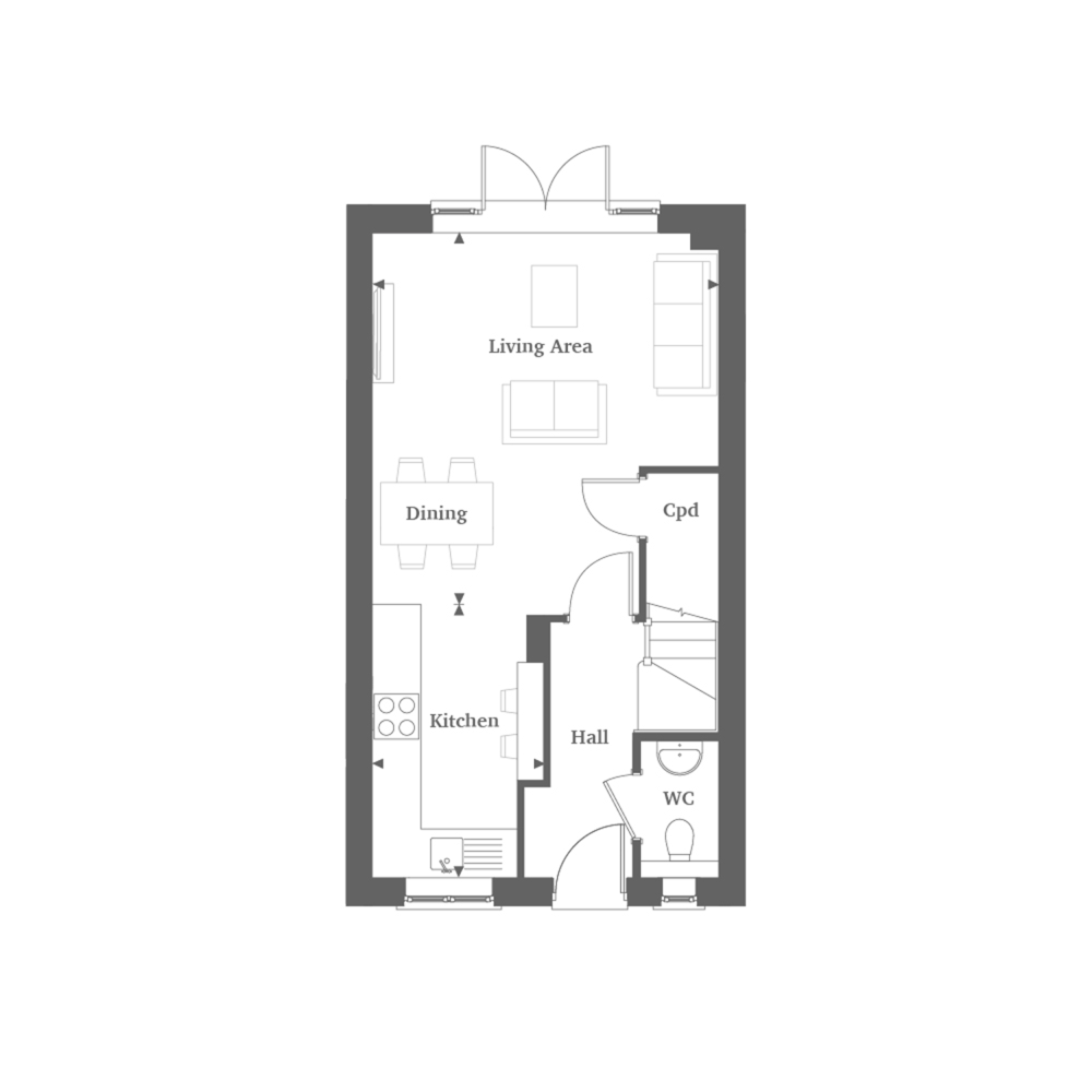 This stylish home offers a bright open plan kitchen/dining/living room with French doors onto an Indian sandstone patio and turfed rear garden