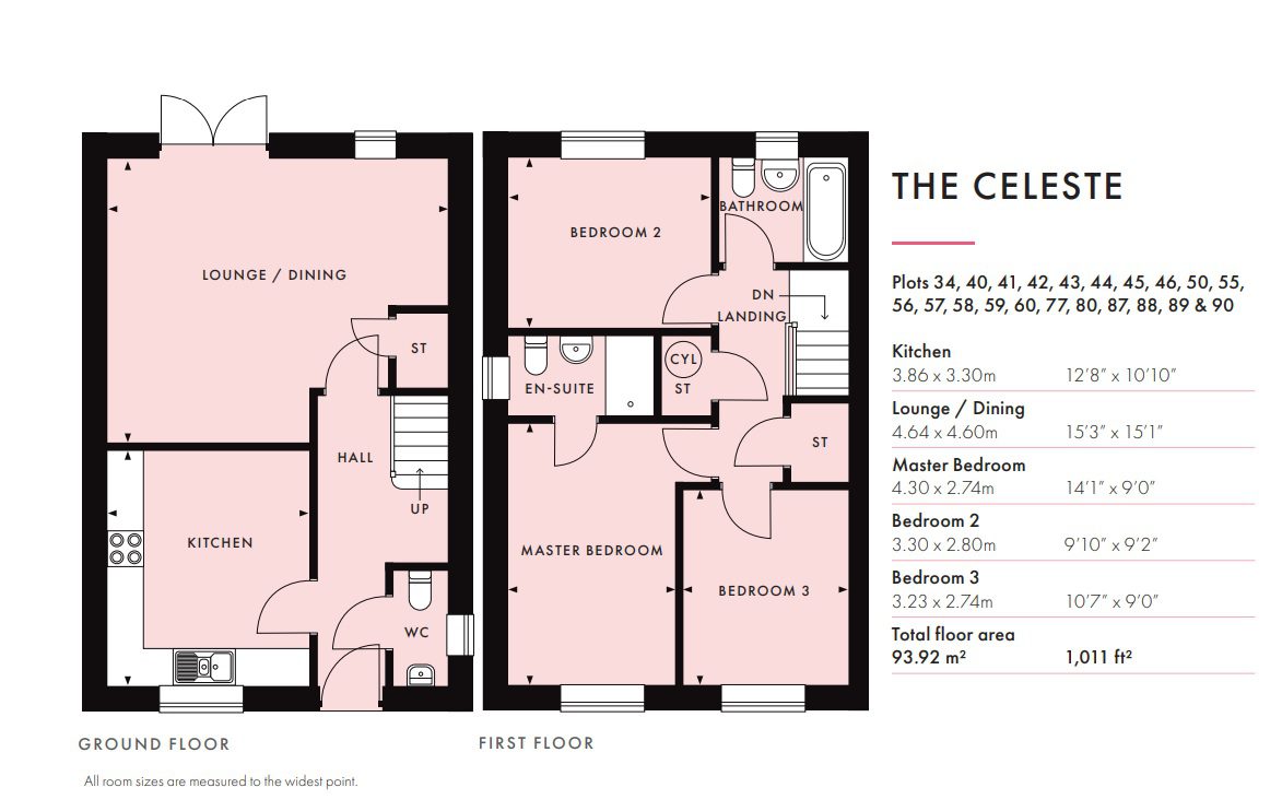 The Celeste is a three bedroom detached home (1,011 sq ft), comprising on the ground floor: entrance hall, cloakroom, lounge, kitchen/dining room with doors leading to the rear garden and understairs store cupboard; the first floor includes master bedroom with ensuite, two further bedrooms, family bathroom and store cupboard. The property also has 2 private off road parking spaces. (Please note only Plots 28 and 71 have a bay window)