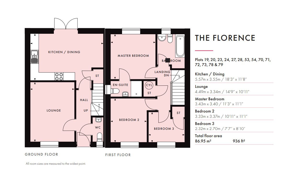 The Florence is a three bedroom semi detached home (936 sq ft), comprising on the ground floor: entrance hall, cloakroom, lounge, kitchen/dining room with doors leading to the rear garden and understairs store cupboard; the first floor includes master bedroom with ensuite, two further bedrooms, family bathroom and store cupboard. The property also has 2 private off road parking spaces. (Please note only Plots 28 and 71 have a bay window)