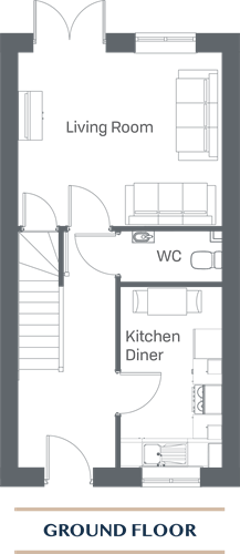 Our two-bedroom townhouse at Cygnet View features a modern openplan kitchen and dining area, along with a bright living room with french doors opening out into the rear garden. A convenient downstairs WC is also located on the ground floor.