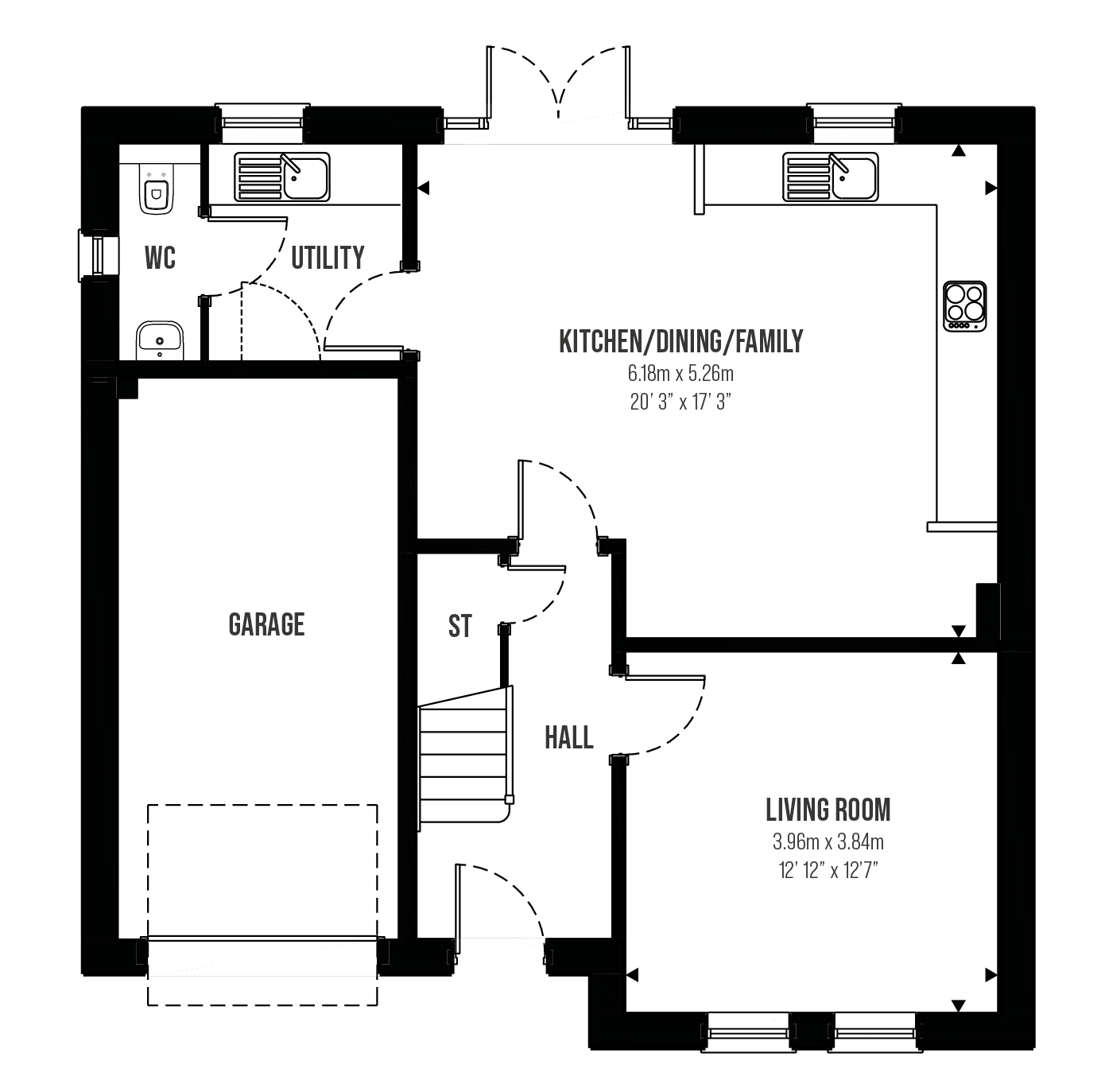 The spacious open-plan kitchen, dining, and family area creates the perfect hub of the home, complemented by a separate utility room with convenient access to the rear garden.