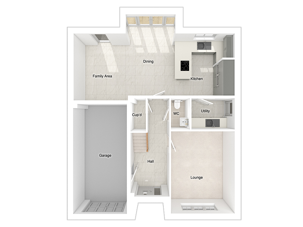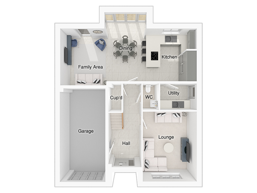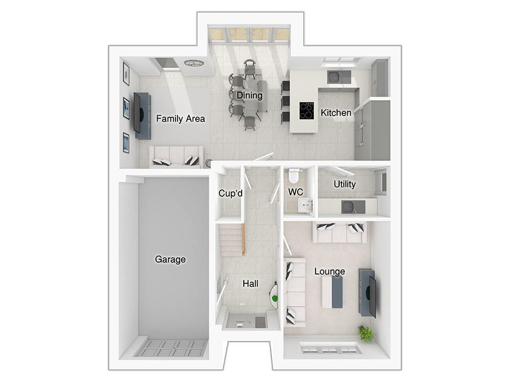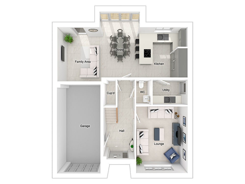 The 4-bedroom Hewson is designed for spacious, open plan living. The kitchen/dining/family area is centred around a peninsula return that seats three, and there is space for a six-seater dining table, along with a three-seater sofa and a media wall ideal for entertaining or unwinding. A standout feature of this space is a rear full height glazed bay window with French doors that open onto the patio and garden, allowing natural light to flood the room, seamlessly extending the living area to the outdoors. There is also a practical utility room offering additional storage space.