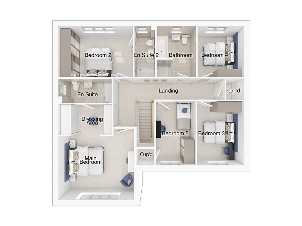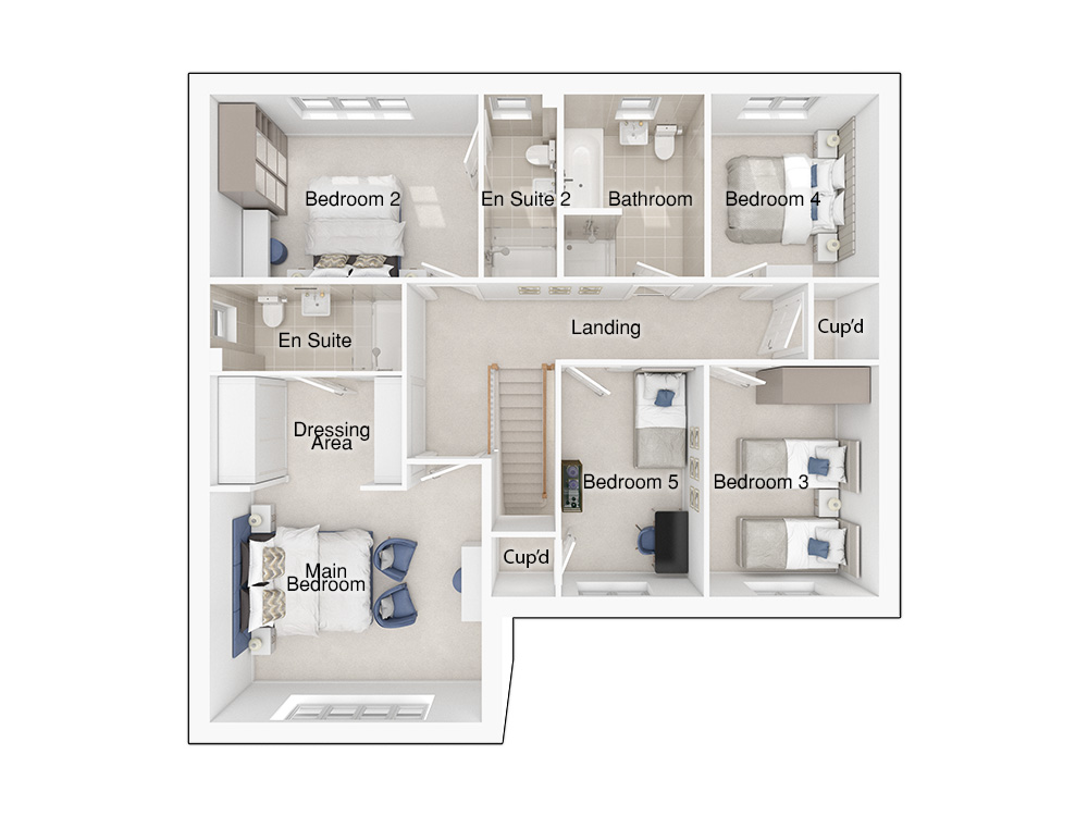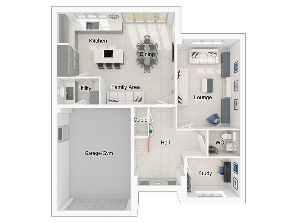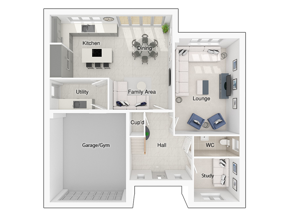 The 5-bedroom Cranford is designed for flexible living, ideal for those who value adaptable spaces. The expansive L-shaped open plan kitchen/dining/family area is a highlight of the home, featuring a stylish kitchen island with space for three stools, adding both functionality and elegance. French doors seamlessly extend the living space, connecting the interior to the outdoors and creating an inviting environment that is perfect for entertaining and relaxed family living. There is also space for a six-seater dining table, a two-seater sofa and two comfy chairs, and a practical utility room offers additional storage space.